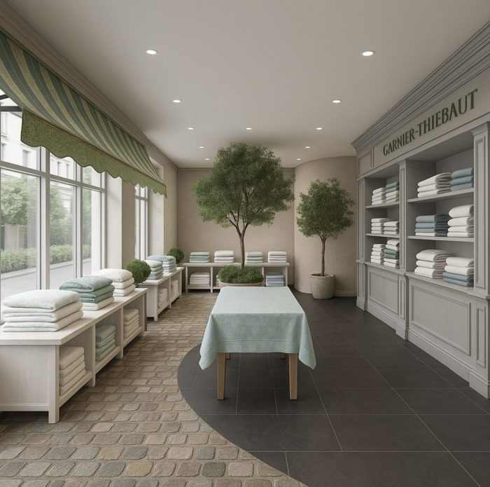 Garnier-Thiebautゾーンでは、床での分離がなくなった分、什器やレイアウトで世界観を立体的に表現することに。ブランドカラーを意識した軽やかな色使いと大きなオリーブの木の配置、オーニング風の小屋根などの案に落ち着いていきました。