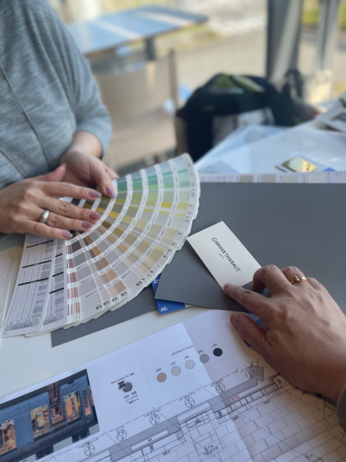 フランスの空気を感じさせる軽やかな色使いや、ウインドウ越しに商品を眺めるような視線設計を意識しました。企業イメージにも配慮し、エレガントさと伝統的な風合いを両立させた空間づくりを目指しています。