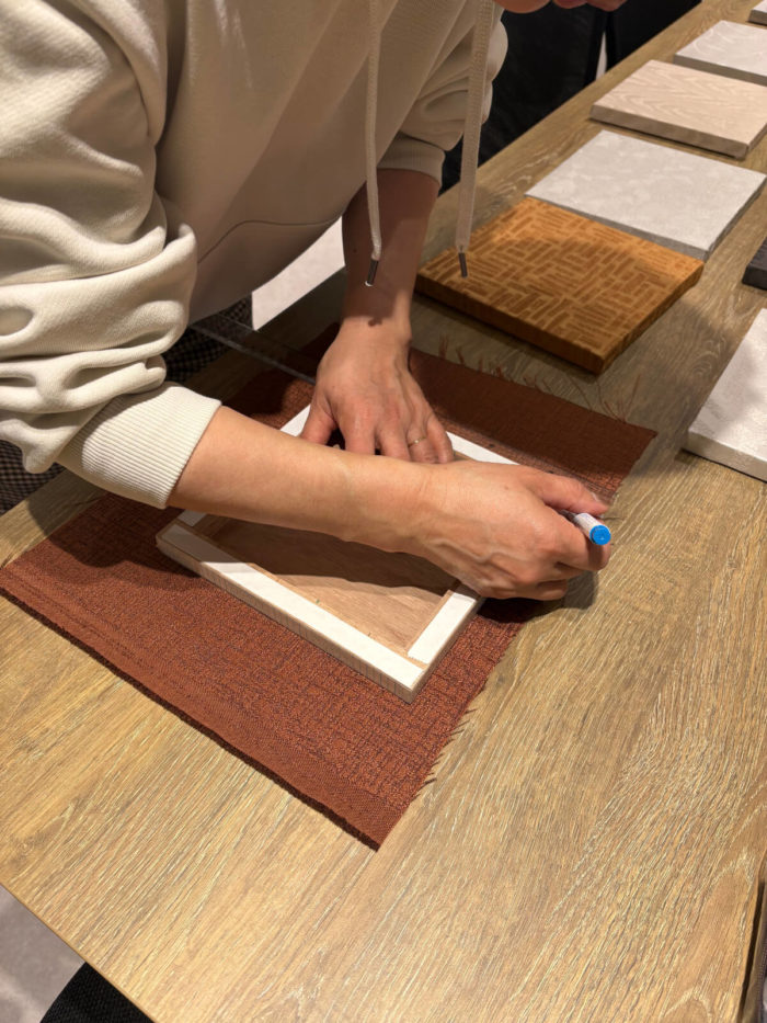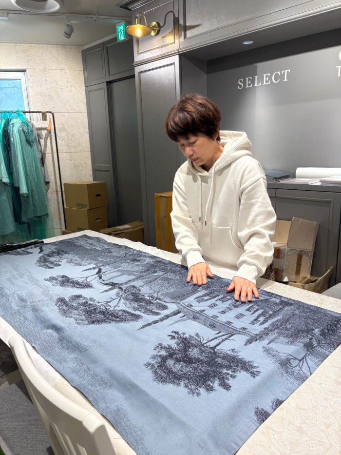 ショールームの商談スペースで、大きな木枠に生地を広げ、Nさんと二人で作業を進めました。