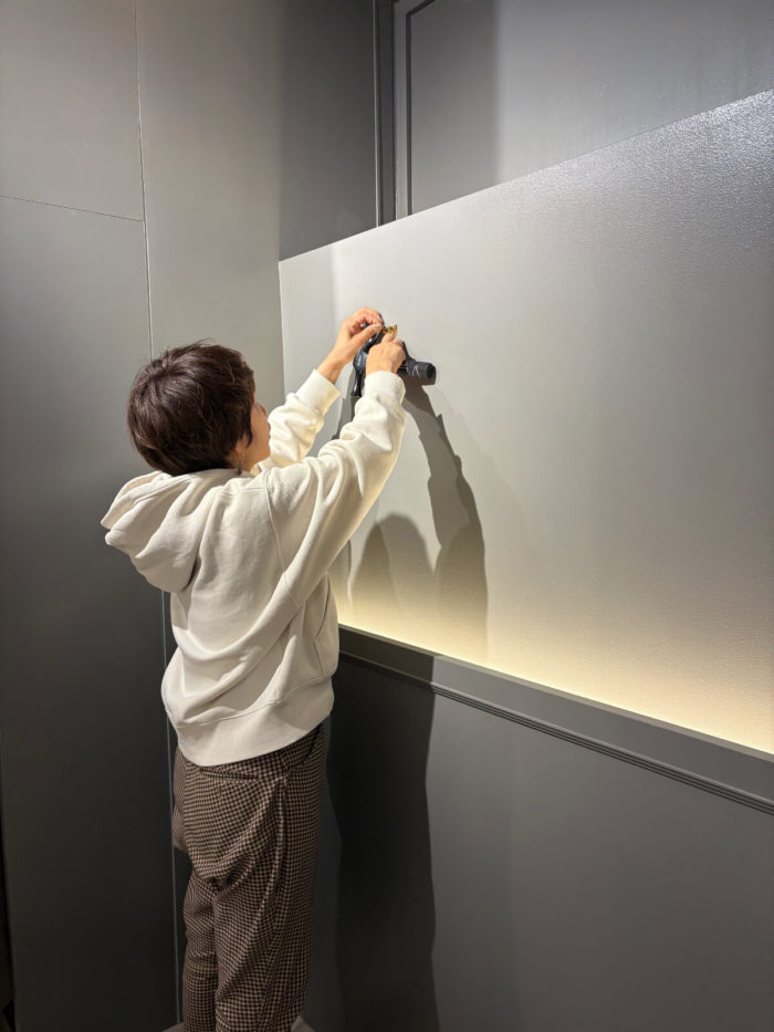 完成したパネルは、Mole’s Breathのグレーの壁面の、間接照明が当たるニッチのスペースへ。